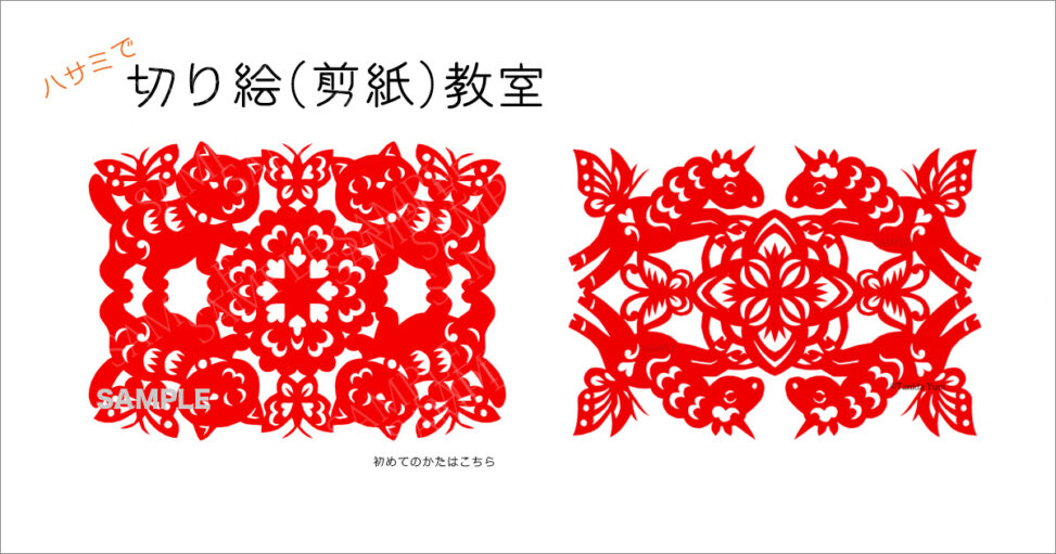 最初に剪紙の簡単な説明とハサミを使って切る練習をします。